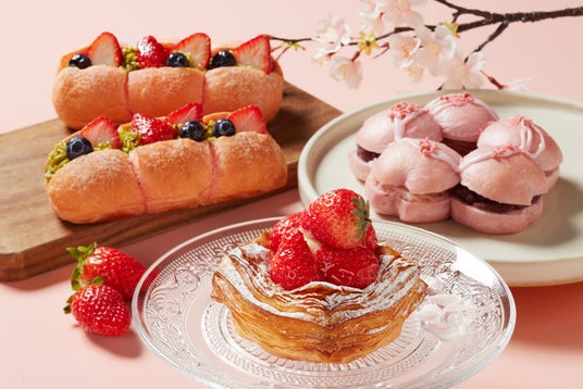 写真手前「いちごデニッシュ」、左奥「いちごとピスタチオのちぎりパン」、右奥「桜のちぎりあんぱん」イメージ