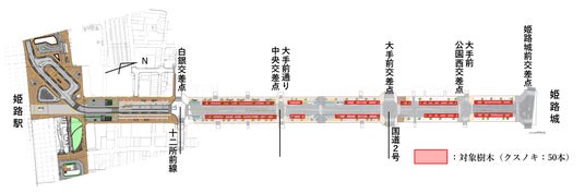 実施エリア内のクスノキをフルカラーLEDで装飾し、世界的照明デザイナーである石井幹子氏の監修のもと、姫路城の彩雲ライトアップと連動した一体感のある演出を行うほか、大阪・関西万博応援をコンセプトに万博開催期間だけの特別演出を行う予定です。