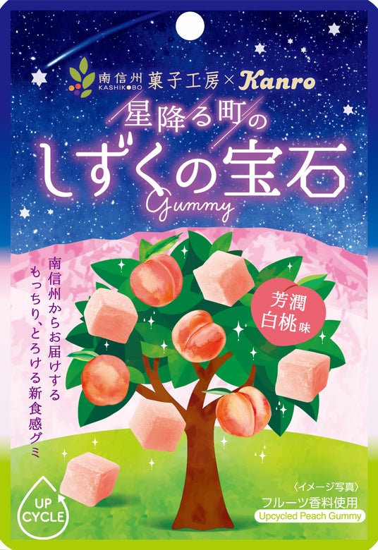 2024年に、りんごのドライフルーツを製造する過程で発生するシロップを使用した「しずくの宝石グミ濃密りんご味」をセブン-イレブンで販売し、アップサイクルである点はもちろん、もっちりした食感と、まるで本物のりんごのような濃厚な味わいをご好評いただきました。第二弾として発売するのは、白桃のドライフルーツを製造する過程で発生するシロップを使用した「芳潤白桃味」です。パッケージは、製造している南信州の美しい南アルプスの山々と、大自然からみることができる星空を表現しています。地球にもやさしく、濃厚な味わいを楽しめるアップサイクルグミをぜひお試しください。