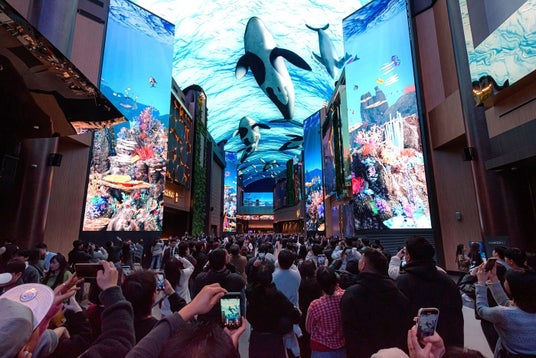 オーロラは、150メートルに及ぶ天井と26メートルの柱を覆う超高解像度LEDサイネージを駆使し、22Kの超高解像度の天井メディアと8Kの柱メディアを組み合わせた比類ない没入感を実現している没入型デジタル・エンターテインメント・ストリートで、大規模な3Dコンテンツが生き生きと映し出されています。