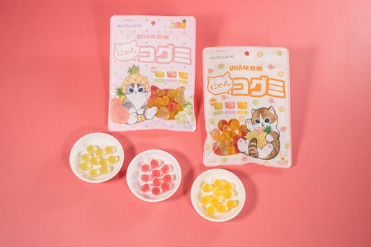 【内容】「mofusand」のにゃんこのお顔を再現したグミです。味はマスカット・ピーチ・パインの3種アソートで、「たちみみ&たれみみにゃんこ」の顔の形が特長です。パッケージは「mofusand」とコラボレーションしたデザインで、全2種類です。