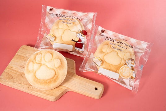 【内容】ねこの肉球がデザインされたメロンパンです。なめらかなカスタードホイップをサンドしました。パッケージは「mofusand」とコラボレーションしたデザインで、全2種類です。
