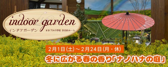 冬に広がる春の香り「ナノハナの庭」があづみの学校多目的ホールに登場です。屋内を埋め尽くす6,000本の黄色のナノハナのインドアガーデン。里山の木々を植栽し、枯山水の庭と穏やかな空間で、和の雰囲気が漂う早春の花畑をお楽しみいただけます。