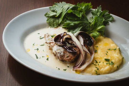 焼きあげた豚肩ロースを野菜とミルクで柔らかく煮込み、揚げたタルディーボがアクセントになって