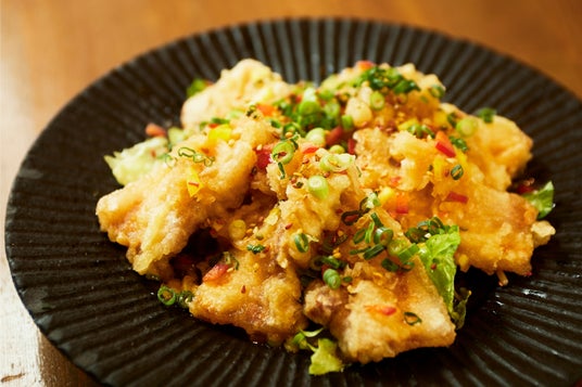 カラッと揚げた豚肉に、おろしぽん酢、パプリカ、ネギ、胡麻をかけてさっぱりと仕上げています。
