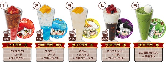 コラボドリンクは、「城とドラゴン」のキャラクターをイメージした「レッドラガール」「ブルドラガールズ」「ホワドラガール」「ブラドラガール」「グリドラガール」の全5種をご用意します。