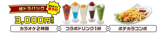 さらに、カラオケ2時間+お好きなコラボドリンク1杯+ポテカラコンボ+オリジナルポストカードがランダムで5枚+ゲームアプリ内アイテムがもらえるQRコード5枚がセットになったお得なプラン「城ドラパック」をご用意します。