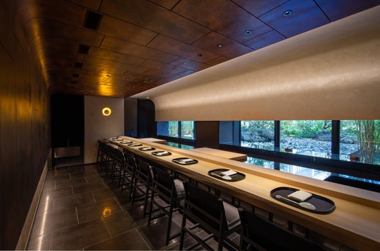 ホテルの3階の中庭にある「かたばみ」は、大人の隠れ家をテーマにしたカウンター9席のみの鮨処。重厚な扉を開け暖簾をくぐると、海の上にあるホテルとは思えないしっとりと落ち着いた空間が広がります。檜の一枚板を使用したカウンター席からガラス越しに見えるのは、額絵のような美しい中庭の緑。熟練の職人が腕を振るう旬の魚を使った握りの数々や、厳選された神奈川の地酒をお楽しみいただけます。