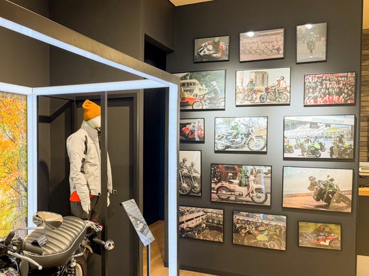 木目調のフロアと白い天井が織りなす明るい店内。モーターサイクルとプラザアパレルがゆったりと展示され、どなたでも楽しめる空間となっています。