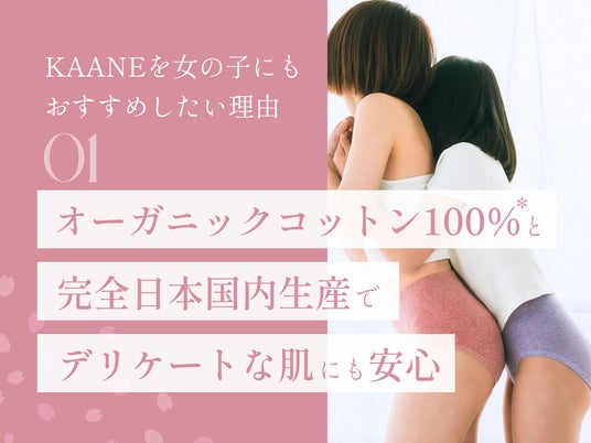 KAANEを女の子にもおすすめしたい理由1.オーガニックコットン100%*と完全日本国内生産で、お子様のデリケートな肌にも安心・安全