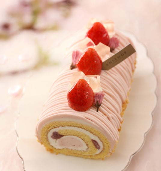 やさしい香りの桜あんクリームと甘酸っぱい苺のコンフィチュールを巻き込み、桜ゼリーや桜の塩漬け、苺を飾りました。