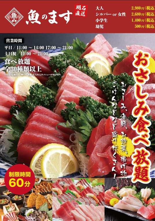 海鮮れすとらん魚のますでは、全30品目以上のメニューが食べ放題で楽しめます。今週末より、新メニューも登場して、より豪華にお刺身食べ放題を楽しむことができます。