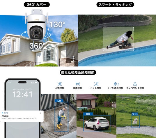 「TC43」は、水平方向360度・垂直方向130度の首振り機能と、自動追尾&パトロールモードを搭載し、1台で広範囲をしっかり監視。AIによる高精度な検知機能で、人物・車両・ペットを識別し、不審な動きを瞬時に検知。アプリ通知でリアルタイムに異常を知らせるため、いつでも安心です。また、スマートトラッキング機能により動く対象を自動追尾し、重要な瞬間を逃しません。ライン通過検知やタンパリング検知機能も備え、セキュリティをさらに強化します。