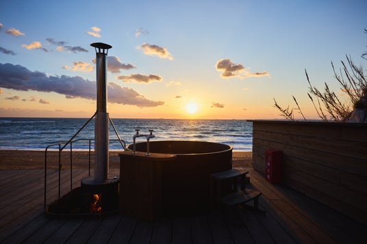 ゆうみBeach Saunaに導入されたのは、薪式のサウナストーブを搭載したアウトドア用サウナキャビン5基と、アウトドア用ホットタブ「レジェンドホットタブ」。海岸にずらりとサウナが並ぶ光景は壮観です。おおきなガラス窓を搭載したモデルなので、富士山と海と夕陽という贅沢な絶景を堪能しながらサウナ体験ができます。また今回のオープンに合わせ、ゆうみSauna Cafe等、系列施設のヒーターもハルビア製にリニューアル。中でも外でも、本場フィンランドの癒しの熱を味わえます。