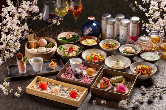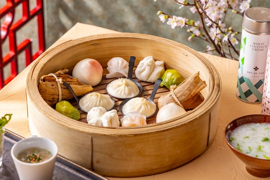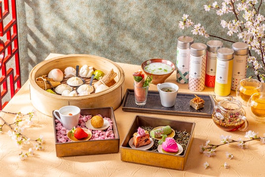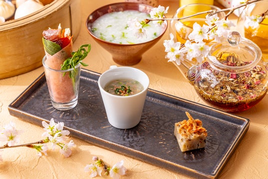お食事には、いちごと桜がアクセントの「ダックスキンロール いちごクレープで」や「ロメインレタス入り中華粥」などの軽食に加え、人気の小籠包、翡翠餃子、桃饅頭など計6種類の蒸し点心が食べ放題で楽しめます。さらに、ロサンゼルス発プレミアムティー「ART OF TEA」の春を彩る中国茶6種類を飲み放題でご提供。
