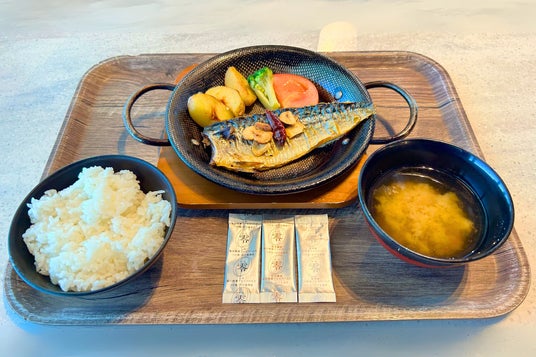 こんがりと焼き上げたサバのガーリックソテーに、零しお・零塩胡椒・零粉末醤油の3つの中からお好みのフレーバーを選んでトッピングします。中央フードサービス株式会社がメニュー開発を行い、当日は131食が提供されました。