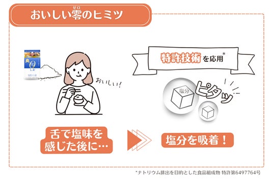 零は、通常の塩と海藻由来の食物繊維である塩分吸着ファイバー(アルギン酸類)を1:1の割合で配合。舌でおいしく塩味を感じた後に、塩分吸着ファイバーがその塩を吸着し体内への吸収を実質的にゼロにするよう設計されています。