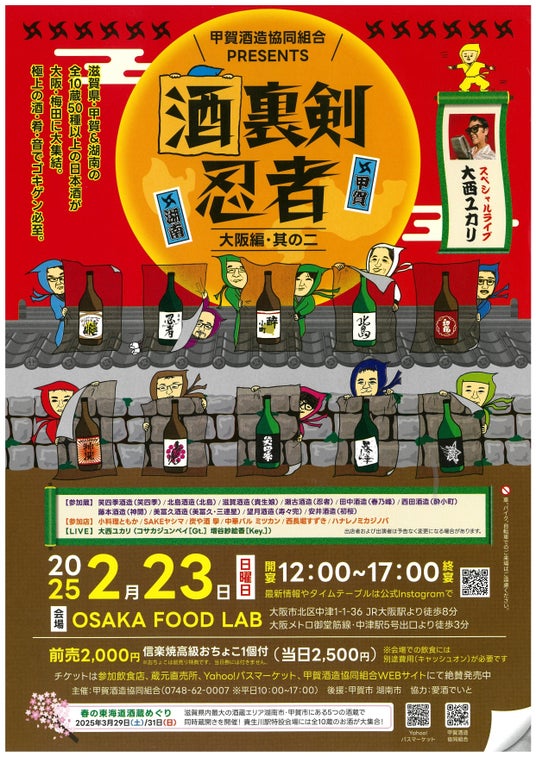 2025年2月23日大阪フードラボにて、甲賀地域全10蔵約50種の厳選日本酒と6店の在阪飲食店の酒肴が楽しめる立食フェスイベント「酒裏剣忍者 大阪編~其の二~」を開催。