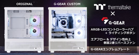 PCケースは人気のThermaltake製 白色ミニタワー『View 170 TG ARGB Snow』に、オリジナルのカスタマイズを施した “G-GEAR White Edition 特別仕様” を採用。一般モデルとの違いは、『ARGB-LEDコントローラーハブ+ライティングボタンを新設』『側面2連ファンをエアフロー強化&内側から支柱を見せないようにリバースファンに変更』『G-GEARエンブレムプレート』など、PCパーツの取り扱いを長年行ってきた TSUKUMO の知識と経験を活かしたカスタマイズにより、デザイン性をブラッシュアップしました。