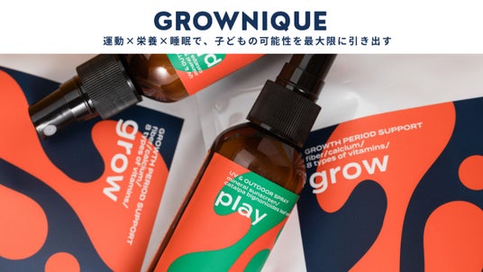 GROWNIQUE(グロウニーク)GROWNIQUEはお子さまの健やかな成長をサポートするヘルスケアブランドです。 “運動×栄養×睡眠で、子どもの可能性を最大限に引き出す”をコンセプトに、専門家による知見と科学的なアプローチで「とりあえず」ではなく「本当に良いもの」を展開します。 1日スプーン1杯で成長期をサポートする日本初(※原料会社調べ)ぐんぐんスイッチ配合粉末栄養補助食品grow、 国産オーガニックの紫外線&アウトドア対策スプレーplay、お子さまだけでなくご家族全員でお使いいただける2アイテムをご紹介します。
