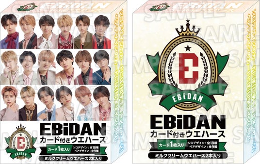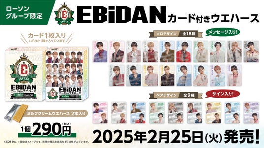 今回発売される『EBiDAN カード付きウエハース』は、ローソングループ(ローソン、ローソンストア100、HMV店舗、HMV&BOOKS online、Loppi端末)限定の販売となり、カードは、メンバーのメッセージがプリントされたソロカード18種類と、メンバーのサインがプリントされたペアカード9種類の全27種類がランダムに入っています。