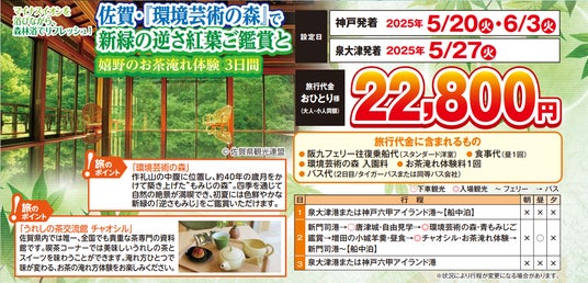 【阪九フェリー利用・関西発団体ツアー】佐賀・『環境芸術の森』で新緑の逆さモミジご鑑賞と嬉野のお茶淹れ体験3日間、販売開始!