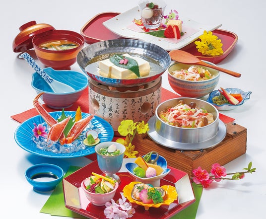 春らしさを演出した彩りプレートや手作り寄せ豆富、かに釜めしなどがお得に楽しめる特選ランチ