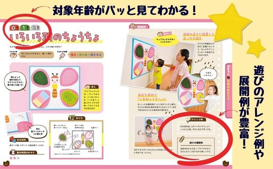 製作時間(難易度)のめやすが一目でわかるので、忙しい保育者の方でも自分のスケジュールに合わせて効率よくおもちゃ作りへ取り組めます。また、遊び方のアレンジ例を豊富に紹介しているので、1歳児と2歳児の混合クラスで同じおもちゃを活用できたり、ひとつのおもちゃを長く楽しめたりと、遊びの幅が広がります。