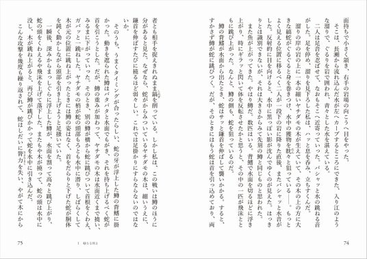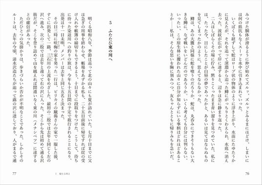 「激しさと穏やかさが、さも当然といった風に共存する山の姿を垣間見て、私は心の殻がはがれて、それが剝き出しになるような戦慄(おののき)を感じていた。川の流ればかりではない。ここでは、魚も獣も人も、死と背中合わせに生きている。ちょっとした油断、そして恐らくは抗いようのない偶然が、それらの生を死へとすり替えてしまうのだ。」(本文より)