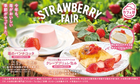 2月19日(水)より、『STRAWBERRY FAIR』として、フレッシュ苺を使用した新作スイーツが登場いたします。ブリュレ仕立てにしたクレープとフレッシュ苺を盛り合わせた「フレッシュ苺&ミルクアイスのクレープブリュレ包み」は、マスカルポーネミルクアイスとホイップクリームをクレープで包んで表面をキャラメリゼし、果肉ゴロゴロの苺ソースとフレッシュ苺を添えました。ミルキーなアイスとホイップクリーム、甘く香ばしいキャラメル風味、甘酸っぱい苺味のバランスが絶妙で、提供前にひとつずつ包んで炙るので、出来立てのおいしさをお楽しみいただけます。さらに、苺果汁を使用し、つるんとしつつもくちどけなめらかな食感が特長のパンナコッタを楽しめる「フレッシュ苺と苺のパンナコッタ」や、和風仕立ての「フレッシュ苺&あずきのパフェ」も新たに登場します。パフェは、つるっとしたのどごしの寒天風ゼリーに果肉ゴロゴロの苺ソースとホイップクリームを合わせ、ストロベリーアイスとフレッシュ苺、ふっくらと茹でた北海道産大納言あずきをトッピングしました。苺やアイスに、和の素材であるあずきや寒天風ゼリーがマッチして、新しいおいしさをお楽しみいただけます。