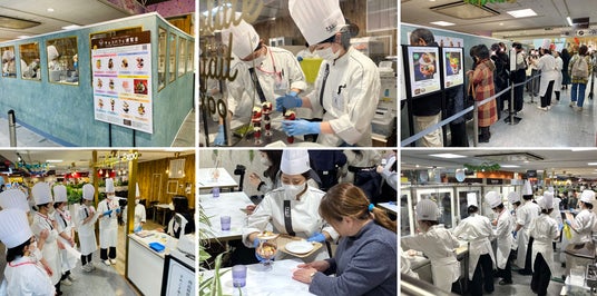 食のプロを育成する教育機関、辻調理師専門学校(大阪市、校長:辻芳樹)は、あべのハルカス近鉄本店で開催された「バレンタイン ショコラ コレクション2025」の人気企画「チョコパフェ博覧会」にて、1月25日(土)・26日(日)の2日間限定で出店し、学生考案のパフェ2種類を販売しました。本校がこのようなバレンタインイベントに出店するのは初めてでしたが、学生たちは数ヶ月間放課後の時間を使って、お客様にどのように味わっていただきたいかを第一に考えながら試作を繰り返し、使用する食材も自分たちで一から吟味してパフェを完成させました。当日は多くのお客様が店舗に並んでくださり、学生たちは製造と接客に分かれて自ら考案したパフェの説明をし、楽しそうに自信をもってパフェを提供していた姿が印象的でした。仕込みの段取りや衛生フローなども意識しながら、普段の授業で学んだことを実践する場として、試作の段階から本番まで大変学びが多く、学生自身の成長につながるイベントとなりました。