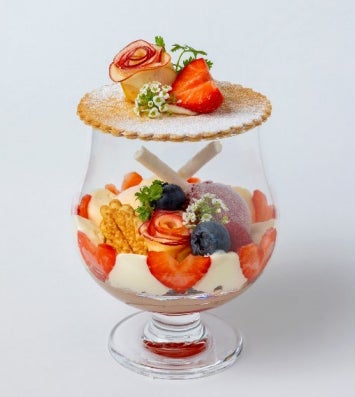 “7本の白いバラ”の花束をイメージしたパフェ。最後までおいしく食感を楽しみながら食べられるように、酸味と甘味のバランスを考え、甘すぎない大人の味わいのパフェに仕上げました。