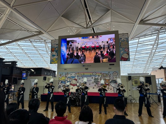 中部地域を代表するスクールバンド「TOHO MARCHING BAND」による華やかなオープニング演奏の後、セントレアの20年を振り返る開港記念動画が放映されました。