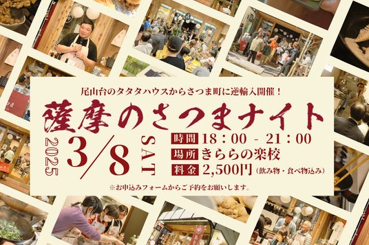 薩摩のさつまブランド推進協議会(鹿児島県薩摩郡さつま町/会長 上野俊市)は、さつま町の旧白男川小学校を活用した施設「うましき里 きららの楽校」(さつま町白男川)にて、「薩摩のさつまナイト」を3月8日(土)に開催します。
