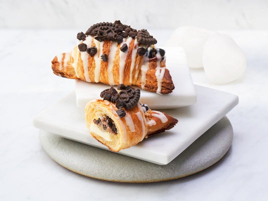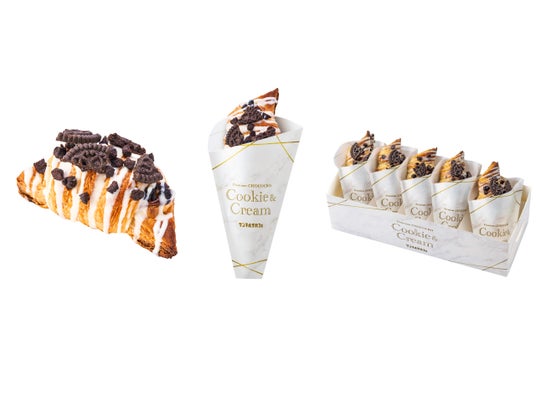 「プレミアムチョコクロ クッキー&クリーム」は、チョコクロ生地にホワイトチョコレート、バニラクリーム、砕いたココアクッキーを包み込み焼き上げた商品です。ミルキーなホワイトチョコレートとなめらかなバニラクリームが調和し、コク深い味わいを生み出します。ホワイトチョコレートと2種のココアクッキーをトッピングし、見た目もクッキー&クリームらしい商品に仕上げました。ほろ苦いココアクッキーが味わいと食感のアクセントとなった、この時期だけのプレミアムなチョコクロです。