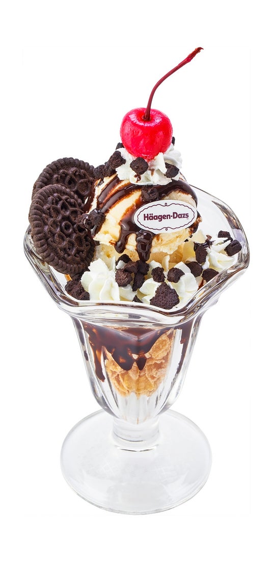 ハーゲンダッツのバニラアイスクリームを2段に重ね、2種類のココアクッキーとホイップクリームをトッピングしたパフェです。パフェの頂上にチェリーをのせることで、喫茶店で食べる気分を味わえるレトロな雰囲気に仕上げました。バニラアイスクリームをココアクッキーやホイップクリームと食べることで、様々な楽しみ方をご堪能いただけます。
