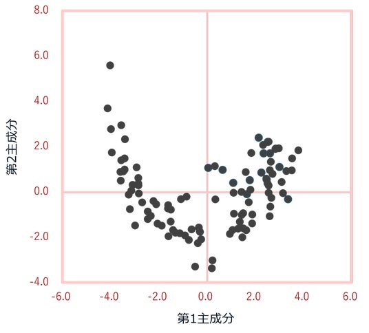 経年による肌の見た目の変化の特徴を把握するため、106名分の差分画像データを用いて、eigenface法*1で解析を行いました。さらに、統計的な処理を加えることで、参加者の経年変化特徴を表す第1、第2主成分を得ました。第1、第2主成分得点をプロットした結果、U字型に分布している様子がみられました(図3)。