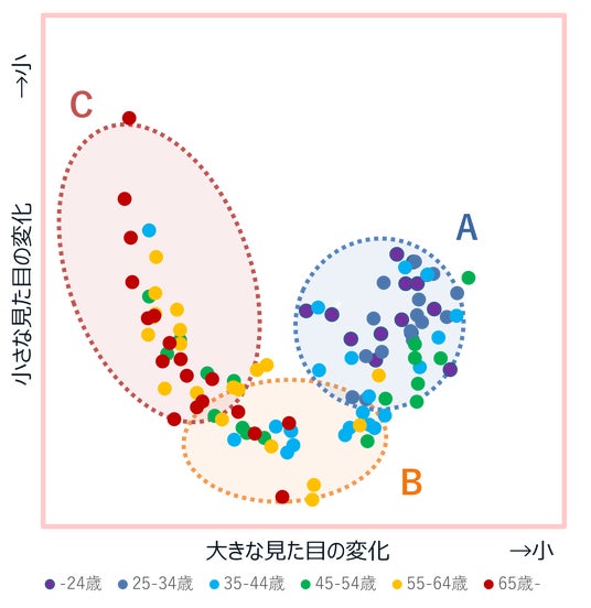 以上の結果より、肌の見た目の経年変化は、量と質が異なる3つのグループに分けられ、各グループの平均年齢の境界となる40歳前後と、50代半ばに肌の見た目の変化の様子が変わる2つの「曲がり角」があることが明らかになりました。