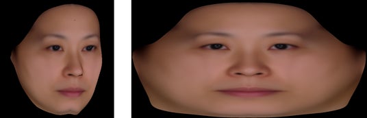 花王は、このデータベースの中から、2010年に16~74歳だった日本人女性106名について、2010年と2015年の顔画像を比較しました。顔を全方位から解析するため、3Dの顔画像をパーツの位置が同一の平面顔画像に変換し(図2)、2010年と2015年の個人の差分画像(顔画像の変化データ)を作成しました。
