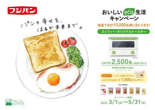 フジパン株式会社(愛知県名古屋市)は、2025年3月1日(土)より5月31日(土)の3ヶ月間、『おいしいeco生活キャンペーン』を実施いたします。期間中、対象商品についている応募券5枚分を1口として応募ハガキまたは市販ハガキに貼り、必要事項を記入の上ご応募ください。抽選でミッフィー・オリジナルトースターを2,500名、Wチャンスとしてトースターの抽選にもれた方にネオバタくんポーチを7,500名、合計10,000名様に当たります。