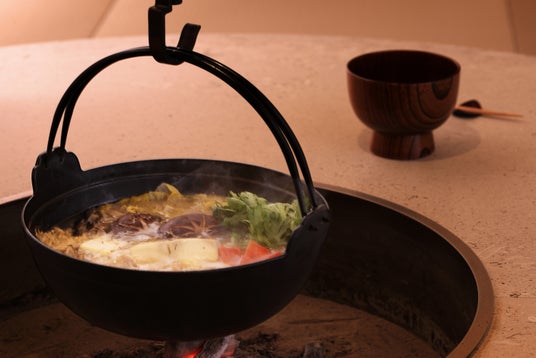 「徒然」の囲炉裏は、シェフが付きっきりで料理を作り提供する、いわばシェフズテーブルです。ゲストの到着後に湯を沸かし始め、素材の段階から調理をスタートすることで、ゲストに食材の香りや見た目などが刻々と変化する様子を五感でお楽しみいただきます。