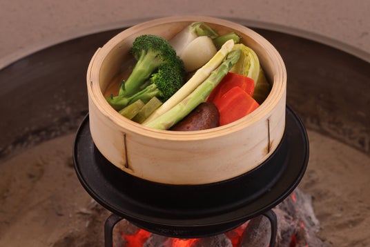 囲炉裏を使った料理では、炭火を使いながら蒸籠・串焼き・灰焼き・塊焼き・鍋など多様な調理法で火を入れることで、素材の魅力を最大限に生かしつつ、囲炉裏料理の幅広さを楽しんでいただきます。間に小鉢や小皿料理を織り交ぜることで、メリハリあるコースに仕上がります。食事の〆には、釜炊きのご飯に鍋の汁物をご用意。最後は囲炉裏で緑茶葉を焙じて作る香り高い焙じ茶で、コースを締め括ります。