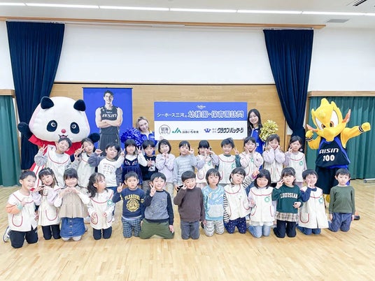2025年1月23日(木)、シーホースくんとSuper GirlsのCHISAKI、SAHOが和泉保育園(安城市)を訪問し、園児の皆さんと一緒にクイズやダンスを楽しみました。今回はJAあいち中央のマイマイも訪問し、参加してくれた園児へお米を一緒にプレゼントしました。