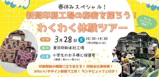 世界最大級の新聞印刷会社 東日印刷株式会社(本社:東京都江東区、代表取締役社長:西川光昭 以下、TONICHI)は、3月28日(金)に「春休みスペシャル!新聞印刷工場の秘密を探ろう!わくわく体験ツアー(ランチ付)」を開催します。本日2月18日より、イベント募集サイト「Peatix」で応募できます。毎年、販売直後に完売となる夏の工場見学ツアーの春特別バージョン。工場見学はもちろんのこと、印刷のお仕事体験やかわいいデザイン新聞を使った工作、食堂ランチビュッフェなど、内容盛りだくさんです。春休みの思い出作りに、ぜひ多くの方のご応募をお待ちしています。