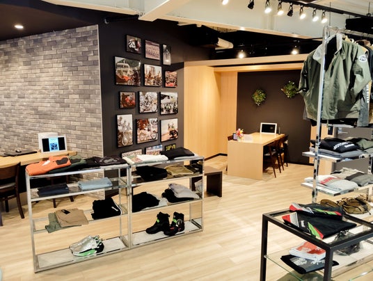 プラザアパレルやグッズは店内のアイランドスペースに展示。実際に手に取って確かめやすいレイアウトです。