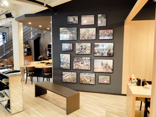 木目調のフロアと白い天井が織りなす明るい店内。モーターサイクルとプラザアパレルがゆったりと展示され、どなたでも楽しめる空間となっています。