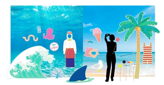 海のKAWAII !! シチュエーションをみずからが演出しながら自身のスマホやカメラで撮影するセルフフォトスタジオ。海の背景をバックに海女の衣装や、原宿海岸っぽくアップデートした葛飾北斎の波、サザエの顔はめパネルなど、KAWAII !! 撮影小物をご用意。自由にアレンジしながらSNS映えする「海の記念写真」 を撮ることができます。さらに、イベント初日(3月1日・土)限定で、プロのカメラマンが来場者の撮影をお手伝いします。お気に入りのポーズで撮影してもらえば、いつもとは違う特別な1枚を撮影することができます。