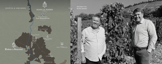 北ローヌの名門ワイナリー「ポール・ジャブレ・エネ」の6代目であるニコラ・ジャブレは、シャトーヌフ・デュ・パプの最高峰と称される「シャトー・ド・ボーカステル」を所有するペラン家と協力し、2009年に「メゾン・ニコラ・ペラン」を設立しました。その後、北ローヌ出身のパートナー、アレクサンドル・カソ氏と手を組み、2012年に「メゾン&ドメーヌ・レ・アレクサンドラン」が誕生しました。