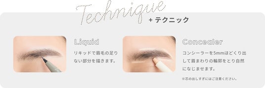 - 自眉のように自然なラインが描き足せるリキッドと、コンシーラーのハイライト効果で自然な立体感のある眉に。