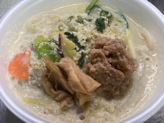 与野本町駅から徒歩で7分という好立地にある武蔵野うどんを代表するうどん店。店内にはまさかの「駄菓子コーナー」もあり、エンタメ性も抜群。そんな店主の作るうどんも創作性やバリエーションに富んでおり、麺の硬さや量を自分好みで注文することができる。今回の出品うどんは寒い冬場にぴったりのホスピタリティ溢れる『スタミナうどん』。挽肉が入ったピリ辛の餡かけと、もやし、ニラのトッピングは絶品。ぜひ舟券攻略のお供に。